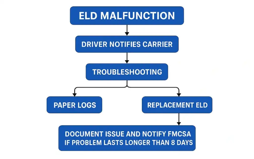 Knowing these fundamentals helps you avoid violations. For instance, if a driver’s ELD malfunctions, ELD regulations give them up to 8 days to get it repaired or replaced (meanwhile they must use paper logs) – if it can’t be fixed in 8 days, you or the carrier need to contact FMCSA for an extension. As a dispatcher, you should have a process for ELD malfunctions so that drivers aren’t caught off guard during roadside checks.