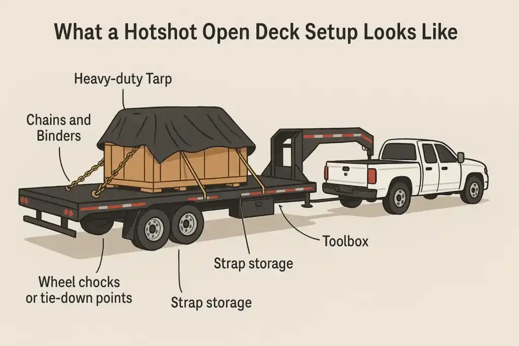 - Load Securement: Both hotshot and flatbed truckers must be masters of load securement. You’re dealing with open decks, no walls – so chains and binders, straps, and tarps are your best friends. In fact, flatbed work is known for its labor-intensive securement: throwing heavy straps or chains over a load, tightening binders, edge protectors, etc., to ensure nothing shifts at 65 mph. Hotshot drivers do the same on a smaller scale. If you have a 10,000 lb piece of equipment on your gooseneck, you might use four chains and binders to tie it down, plus strap any smaller items. Tarps are often required to cover loads that can’t get wet or blasted by wind. Flatbed trailers commonly carry large tarps (e.g. 20’x25’ steel tarps or lumber tarps with flaps) to cover loads – tarping a full load can be a real workout. Hotshots may need tarps too, but usually smaller ones. Keep in mind tarping and un-tarping is unpaid work that comes with open-deck trucking. Some loads are “no tarp” (which drivers appreciate); others will pay extra for tarping. When choosing hotshot vs flatbed, consider that flatbed dispatch jobs will involve more frequent heavy securement and tarping of very large loads, whereas hotshot loads, while still requiring proper securement, might be a bit quicker to tie down due to smaller size. Either way, safety is paramount – improperly secured cargo is a hazard and a big violation if caught. Both hotshot and flatbed operators must know the DOT securement rules by heart.